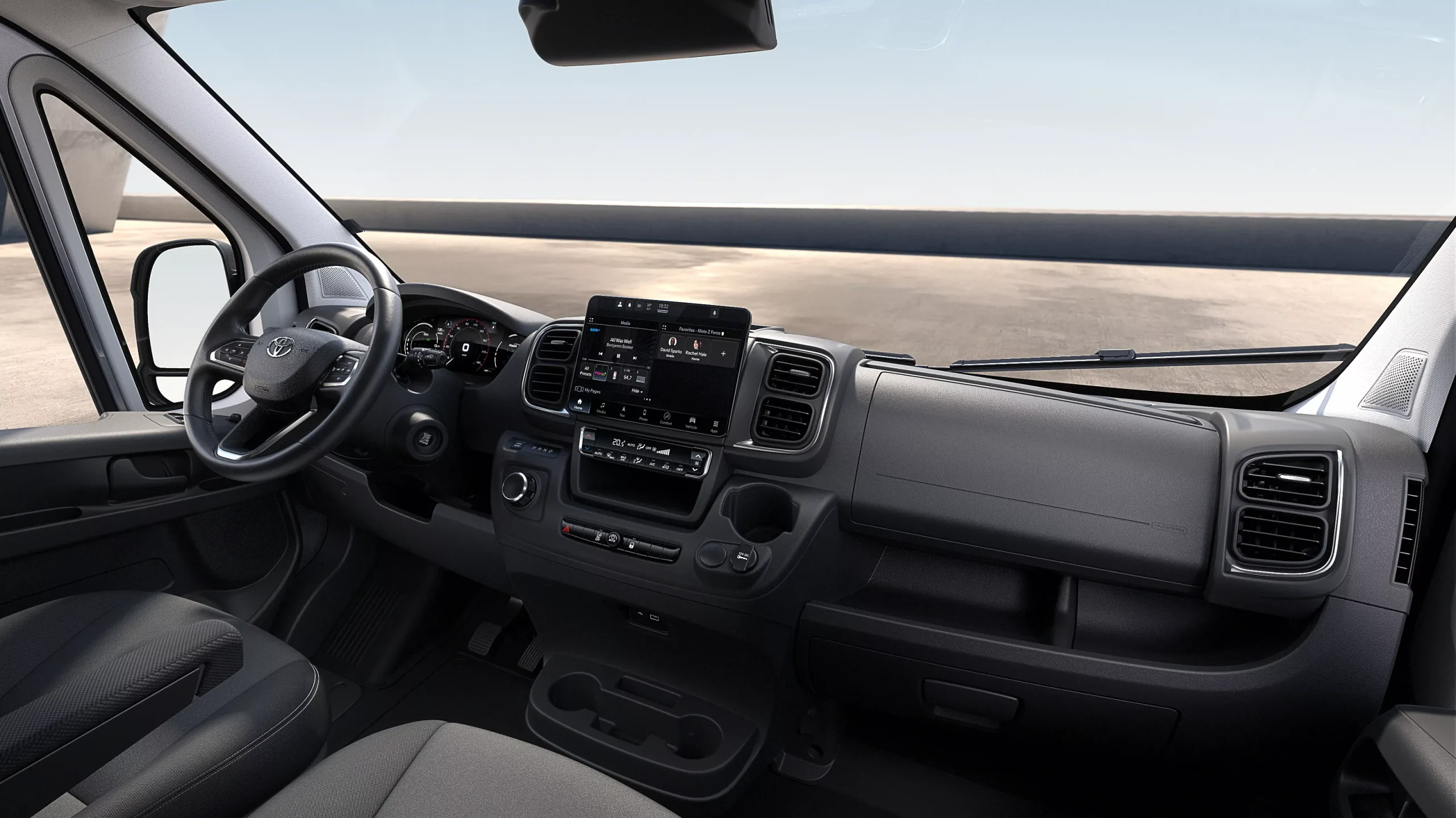 A Proace Max utasterének kijelzője világos és könnyen leolvasható, míg az érzékeny multimédiás érintőképernyő biztosítja a hozzáférést a telefonhívásokhoz, a navigációhoz és a MyToyota csatlakoztatott szolgáltatások nyújtotta kényelméhez.